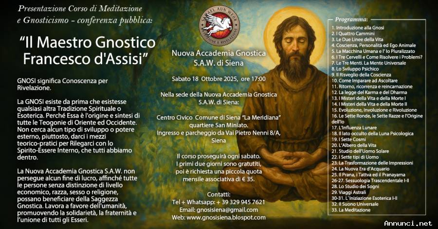 La Nuova Accademia Gnostica di Siena come Scuola di Meditazione per il Risveglio della Coscienza presenta il Corso Pratico: LA GNOSI UNIVERSALE, con la Conferenza Pubblica dal titolo: