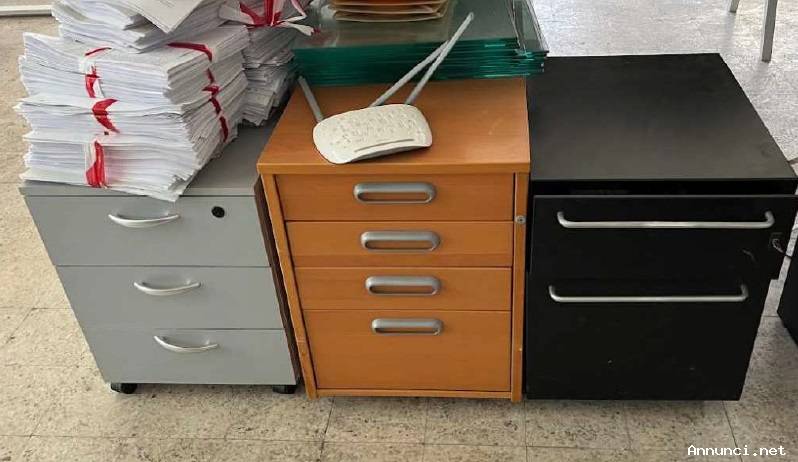 Trattasi di scrivanie con struttura in alluminio e piano in legno laminato, cassettiere di varie dimensioni, scaffali in ferro con ripiani in legno laminato, mobili con struttura in metallo con pannellatura ed ante in legno bilaminato; lo stato di conservazione è discreto.