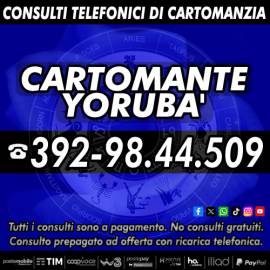 Se necesseti di una risposta immediata per una questione importante, oppure hai una perplessità, o vuoi un semplice consiglio su una determinata scelta che devi fare il Cartomante YORUBA puo' aiutarti con un consulto approfondito di Cartomanzia con la lettura dei Tarocchi, in modo particolare gli Arcani Maggiori. Devi solo chiamare componendo il numero di cellulare che vedi nella foto in allegato, chiama tutti i giorni dalle ore 9 alle 21 per prenotare un consulto di Cartomanzia. Avrai a disposizione 30 minuti per porre le domande che ti stanno piu' a cuore. Per maggiori dettagli circa le modalità del consulto ti invito a chiamare. Ricordo infine che ogni singolo consulto è a pagamento con ricarica telefonica. Studio di Cartomanzia CARTOMANTE YORUBA'