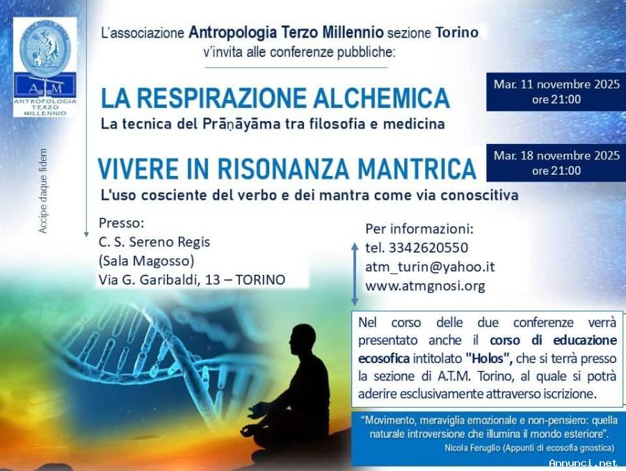*Nel corso delle due conferenze verrà presentato anche il corso di educazione ecosofica intitolato "Holos", che si terrà presso la sezione di A.T.M.-Torino, al quale si potrà partecipare esclusivamente attraverso iscrizione.
