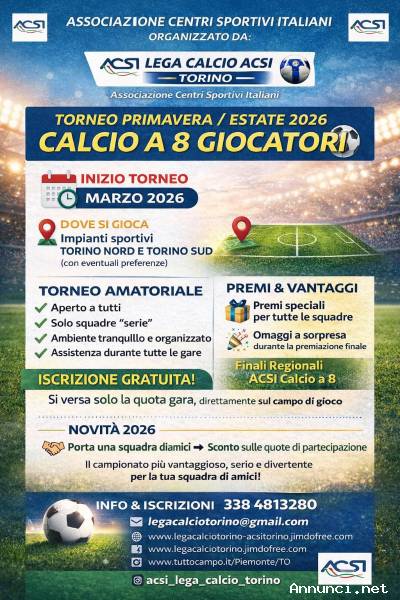 La nostra Associazione Sportiva è attiva da molti anni nell'organizzazione di campionati e tornei a Torino, offrendo un ambiente competitivo e amichevole per tutti i nostri membri. Partecipate ai nostri eventi per vivere l'emozione del calcio a 8 in un'atmosfera di divertimento e fair play." La nostra prossima manifestazione è il nuovo Torneo amatoriale di calcio a 8 Primavera / Estate 2026 con iscrizione gratuita e versamento di una quota ogni gara. Il torneo più serio, vantaggioso e divertente per la tua squadra ! Massima serietà, NO LUCRO. Per informazioni tel. 338 4813280.