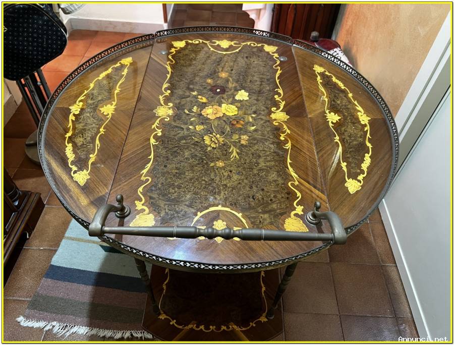 Elegante carrello da tè / portavivande vintage in legno, con intarsi floreali su entrambi i ripiani e struttura solida.