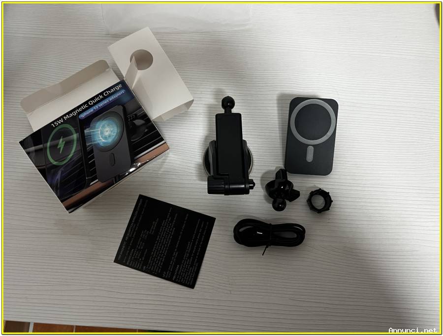Vendo caricabatteria da auto wireless magnetico compatibile con tutti gli iPhone con MagSafe. Perfetto per ricaricare in modo rapido, stabile e senza cavi qualsiasi modello di Iphone che supporta la ricarica wireless mentre si guida.