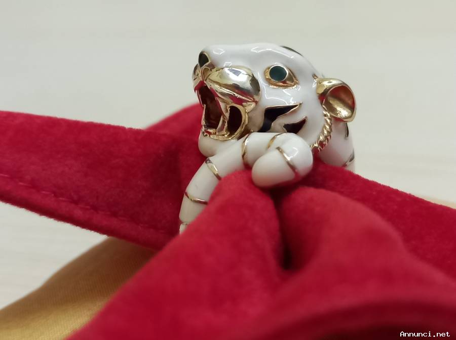 Anello tigre in argento 925 placcato oro 18 Kt smalto bianco modello esclusivo "Legnazzi" con marchio depositato "Legnazzi" all'interno.