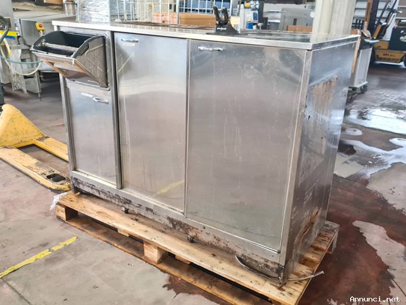 Banco bar per macchina caffè usato, si tratta di un retro banco bar in acciaio inossidabile dotato di cassetto per battifondi caffè, tre ante e filtro di pulizia caffè di marca Pro-fondi, vedere foto;