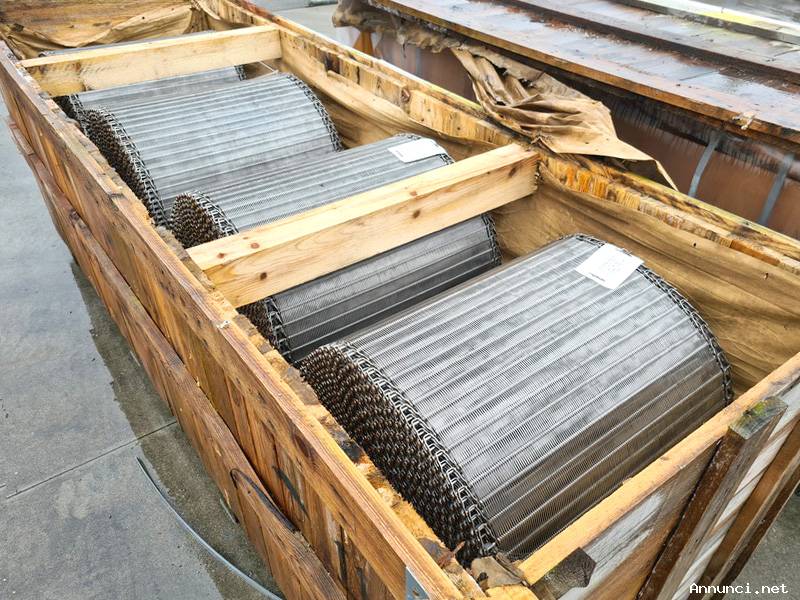 Nastri trasportatori in rete metallica usati, in realtà si tratta di 3 casse di legno contenenti ciascuna 4 rotoli di nastro in rete in acciaio inox AISI 304 vico flex-37-274-12 NUOVI quasi sicuramente adatti per temperature fino a 600°C e con doppia catena di avanzamento, vedere foto;
