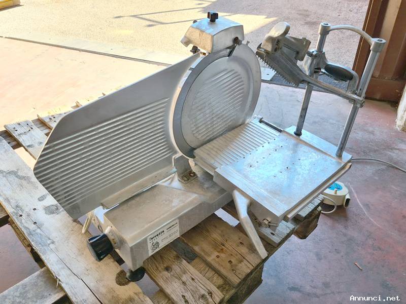 Affettatrice per salumifici usata, si tratta di una affettatrice in acciaio inox di marca ABM mod. AS 370 funzionante a 220v utilizzata per affettare: salumi, carni, formaggi, etc. adatta per: supermercati, gastronomie, salumifici, etc. vedere foto, purtroppo abbiamo usato un detersivo non adatto per lavarla e l'alluminio si è macchiato;