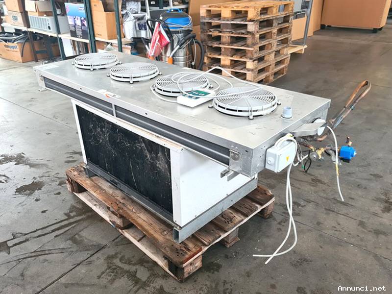 Evaporatore con monoblocco usato, si tratta di un evaporatore biflusso TN a 4 ventole di marca Rivacold mod. RDF4250 con monoblocco mod. STH054Z012DF da 2.00hp (vedi rese tra le foto), adatto per celle da 40/50m³
