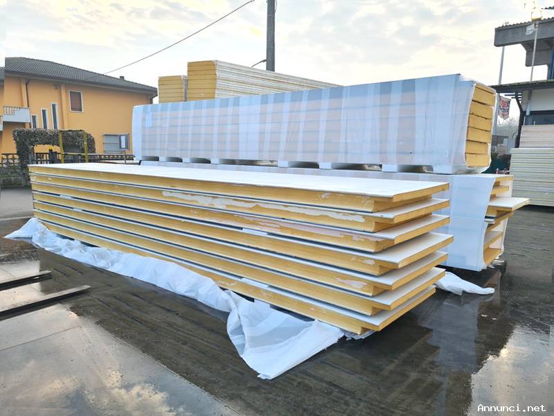 Pannelli di seconda per congelatore da 530m³, commerciando pannelli nuovi di seconda scelta abbiamo ritirato un ottimo lotto di pannelli sp.15cm già preparati per la realizzazione di una cella bassa temperatura con pavimento immerso con scanalatura in alto per raccogliere il tetto, finitura esterna in lamiera zincata preverniciata bianca, lamiera interna in acciaio inox AISI 304 sfogliato nella parte bassa per 30cm.